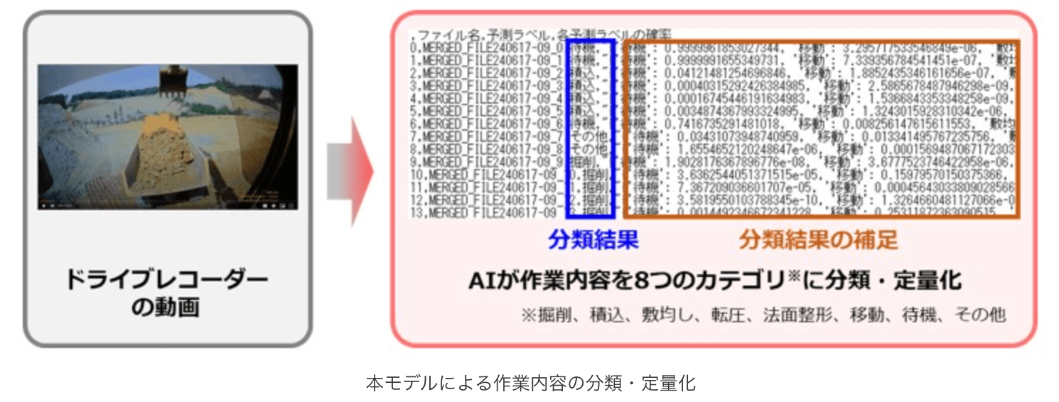 この技術の特徴は、バックホウに搭載されたドライブレコーダーの動画を活用している点です。AIが映像を解析し、「掘削」「積込」「敷均し」「転圧」「法面整形」「移動」「待機」「その他」の8つに作業内容を分類します。これまで、どの重機がどの作業にどれだけ時間を使っているかを把握するには、現場担当者が手作業で記録する必要があり、大きな負担となっていました。AIの活用により、その手間が大幅に削減されます。