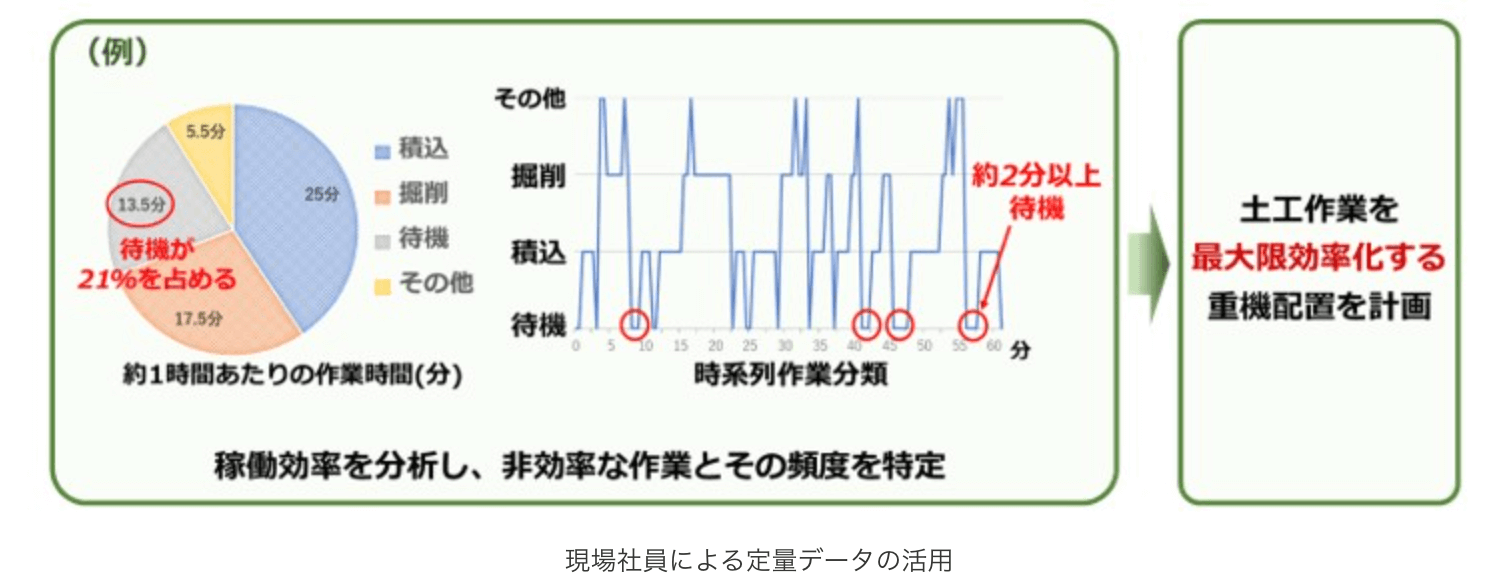 今回の工事では、最大20台のバックホウが稼働しており、AIが算出した定量データをもとに、非効率な作業や待ち時間が多い工程を可視化しました。特に改善余地が大きいとされる「待機」作業は、97%を超える高い精度で分類できたとされています。これにより、重機の台数や配置を見直し、必要なところに必要な重機を集中させる判断がしやすくなりました。