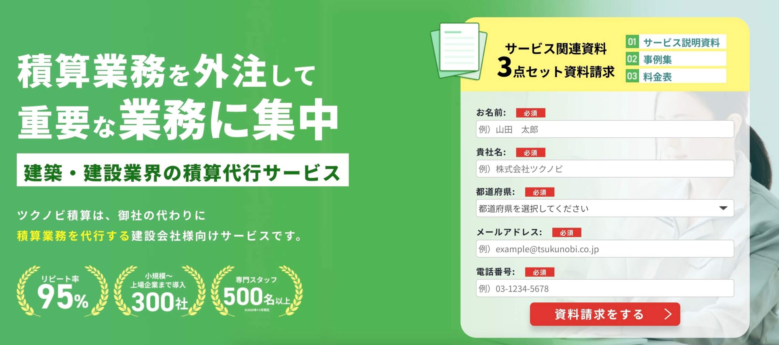 ツクノビ積算は、時間のかかる積算業務や見積書、発注書の作成などをプロが代行する建設業特化のアウトソーシングサービスです。
