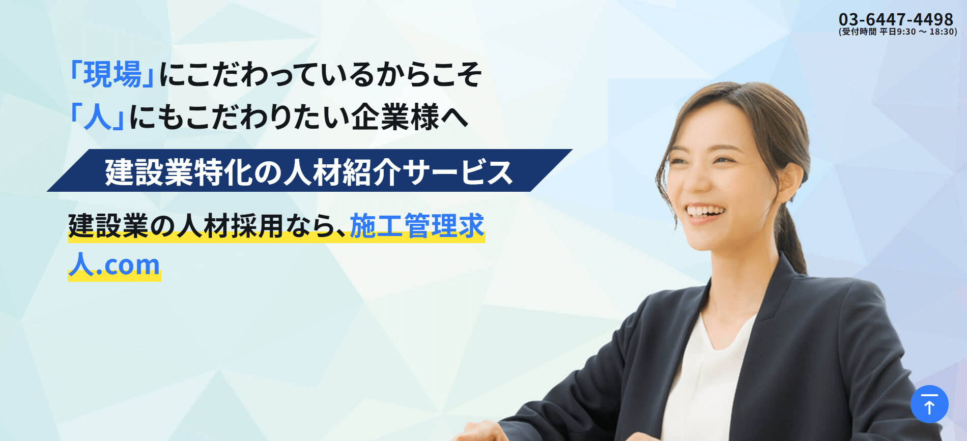 施工管理求人.com」は10年以上建設業界特化の採用支援を行ってきた転職支援サービスです。その名のとおり施工管理職の転職に強く、施工管理職を募集している建設業者に特におすすめの求人サイトです。