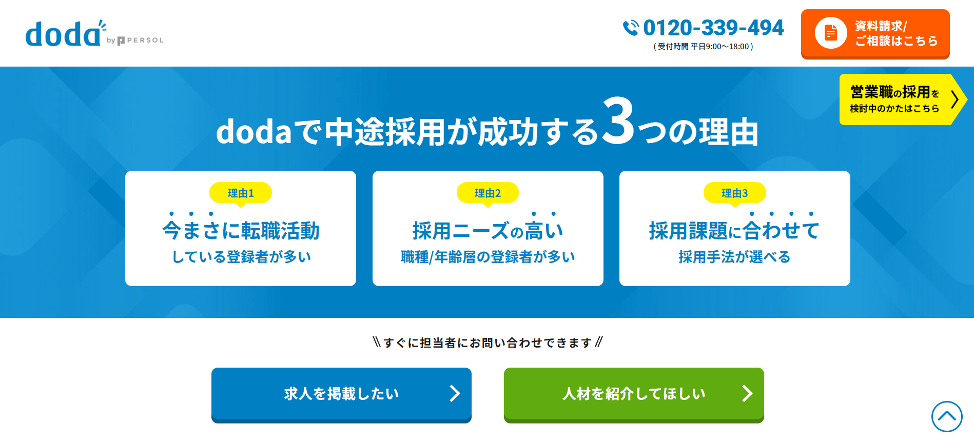 dodaはTVCMやWEB広告のほか、交通広告、他転職系メディアとの提携施策など様々な手法でビジネスパーソンにアプローチします。営業職や技術職など、採用ニーズの高い人材や35歳未満の若い人材が数多く登録されています。