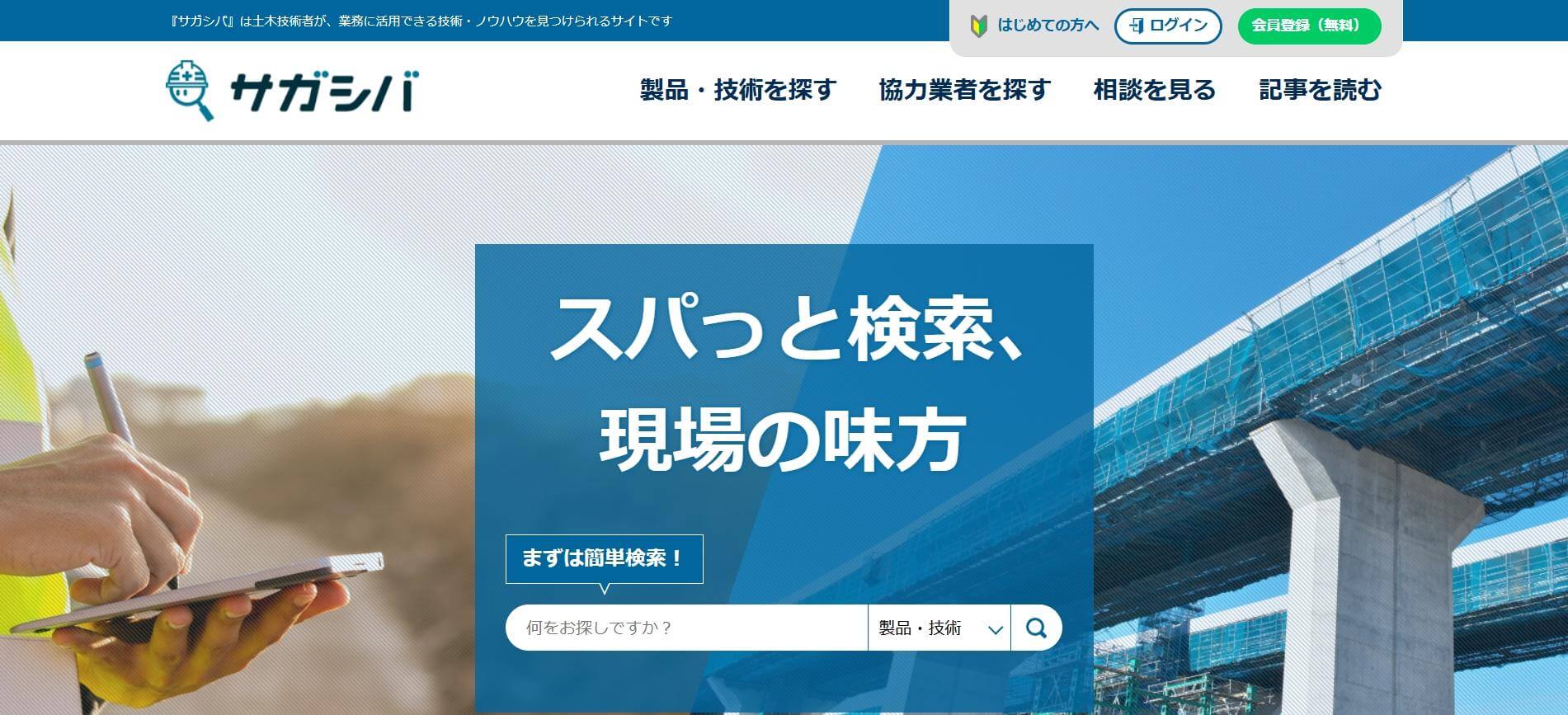 サガシバは土木分野に特化したマッチングサイトで、製品や技術のデータベースを活用しながら最適な協力業者を探せます。
