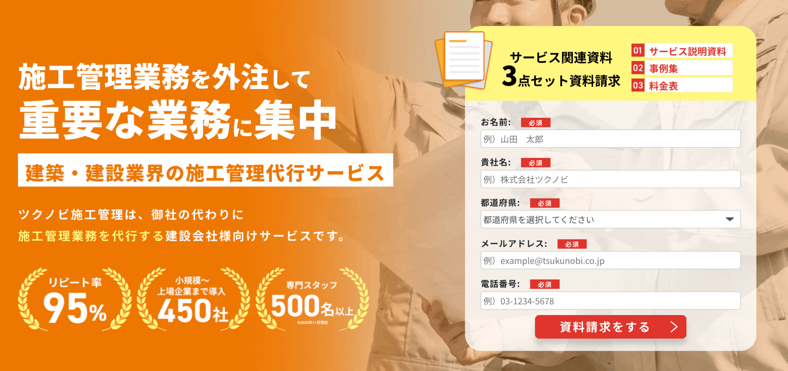 施工管理の人手不足で業務がスムーズに進まない場合や、施工管理人材を確保したい場合は、建設業特化の業務代行サービス「ツクノビ施工管理」の利用がおすすめです。