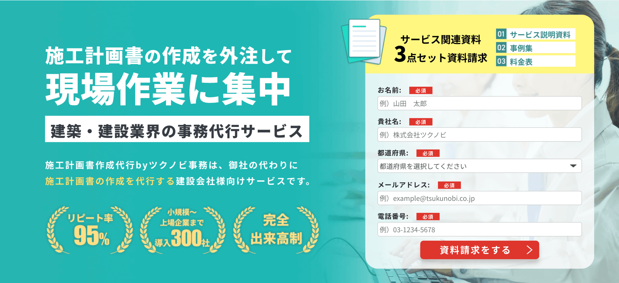 施工計画書作成代行byツクノビ事務は、施工計画書の作成を代行する建設業特化のアウトソーシングサービスです。 施工計画書の作成を外注することで、対応案件数増加による売上向上、残業時間の削減によるコスト削減などにつながります。詳細はぜひこちらからご確認ください。