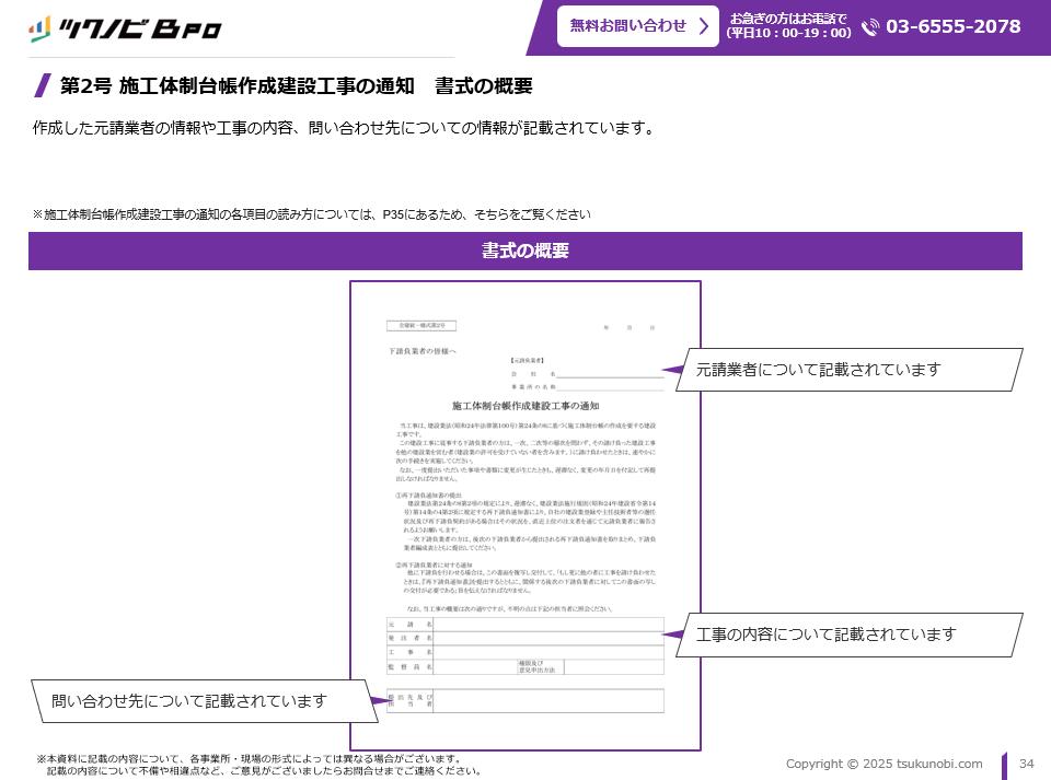 元請業者は、下請契約の締結時に、以下の内容を記載した施工体制台帳作成通知書を下請業者に交付します。