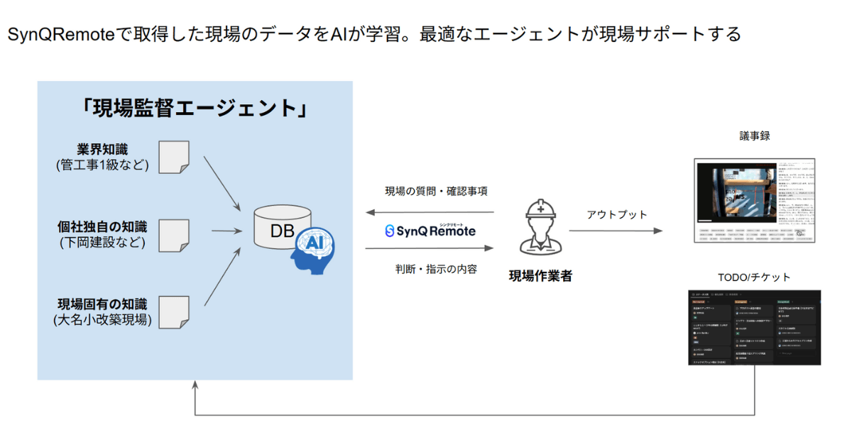 「SynQRemote Agent」は、現場作業中の映像や音声、作業の流れといった情報をAIが解析し、熟練した現場監督のように判断や指示、記録を支援する仕組みです。これまで提供してきた遠隔支援ツールに蓄積された数千件の現場データを学習しており、建設やインフラ分野に特化した知識を持つ点が特徴です。ベテランが常に立ち会えない現場でも、作業の進め方や確認ポイントをAIが補助することで、経験の浅い人でも安心して業務を進められる環境を整えます。