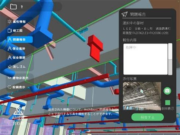 さらに、FM管理ツールと連携している点も注目です。点検中に不具合を発見した場合、該当するBIMオブジェクトを選択し、その場で写真付きの報告が可能です。これにより、事務所に戻ってから行っていた報告作業が簡略化され、情報共有のスピードも向上します。