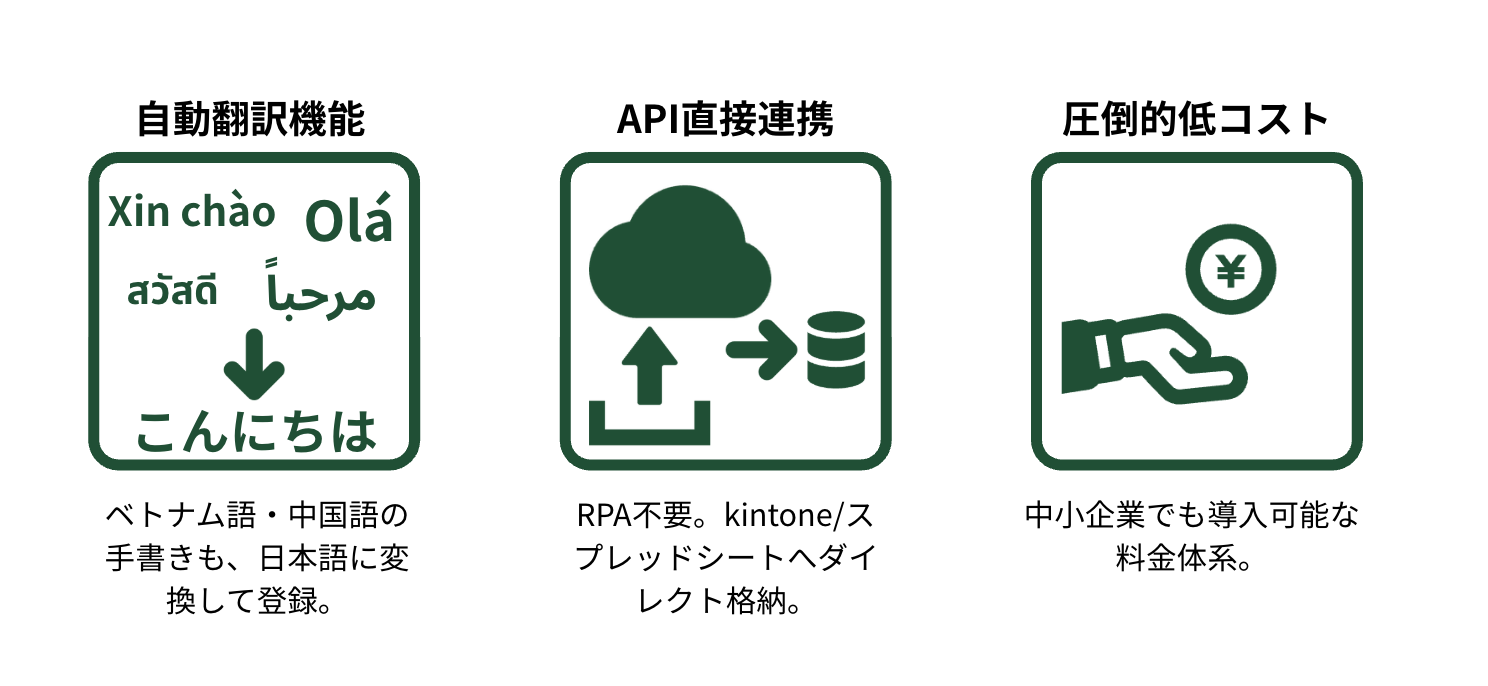 汚れた帳票や暗い現場で撮影した画像でも高精度に文字を認識し、日本語だけでなくベトナム語やインドネシア語の手書き文字も自動翻訳した上でデータ化します。読み取った情報は、kintoneやGoogleスプレッドシートなど既存のシステムへ直接登録でき、複雑なRPA設定も不要です。