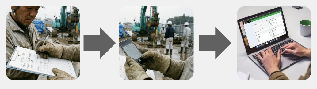 近年、建設現場では外国人技能実習生や特定技能人材の比率が高まり、「手書き文字が読めない」「母国語で書かれた帳票を翻訳し直している」といった問題が日常的に発生しています。さらに、入力のためだけに事務所へ戻る必要があり、移動時間や残業が増える原因にもなっていました。