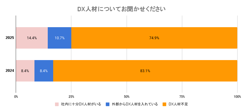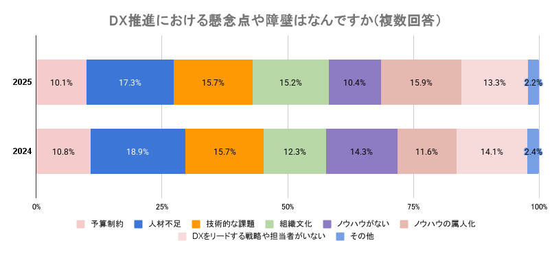 一方で、DX推進における課題も変化しています。これまで最大の壁とされてきた「DX人材不足」はやや改善傾向にあるものの、新たに「ノウハウの属人化」が2024年の11.6%から15.9%へと、大きな問題として浮上しました。特定の担当者だけが分かる仕組みでは、せっかくのDXも十分に活かせません。また、社内データが整理されていない、システム同士が連携できないといった課題も依然として残っています。